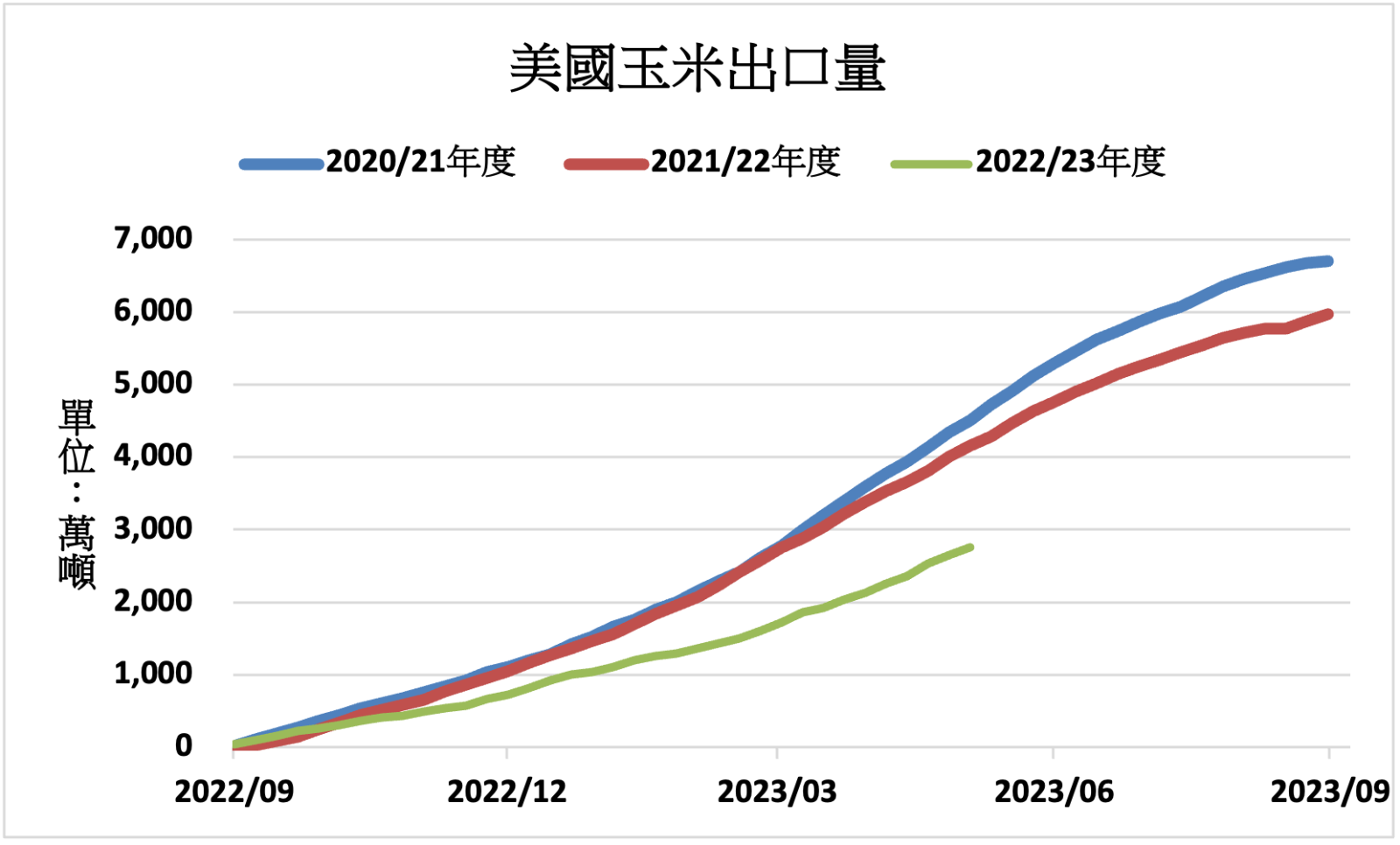 玉米當週出口裝船量1,086,500公噸,較前週與過去4週均值分別減少5%與17%,主要出口市場為墨西哥(414,000公噸)與中國大陸(409,900公噸)。2022/2023年度至今,美國玉米出口量年減42%至2,760萬噸。美國農業部預估本年度玉米出口量將年減25%至4,700萬噸。